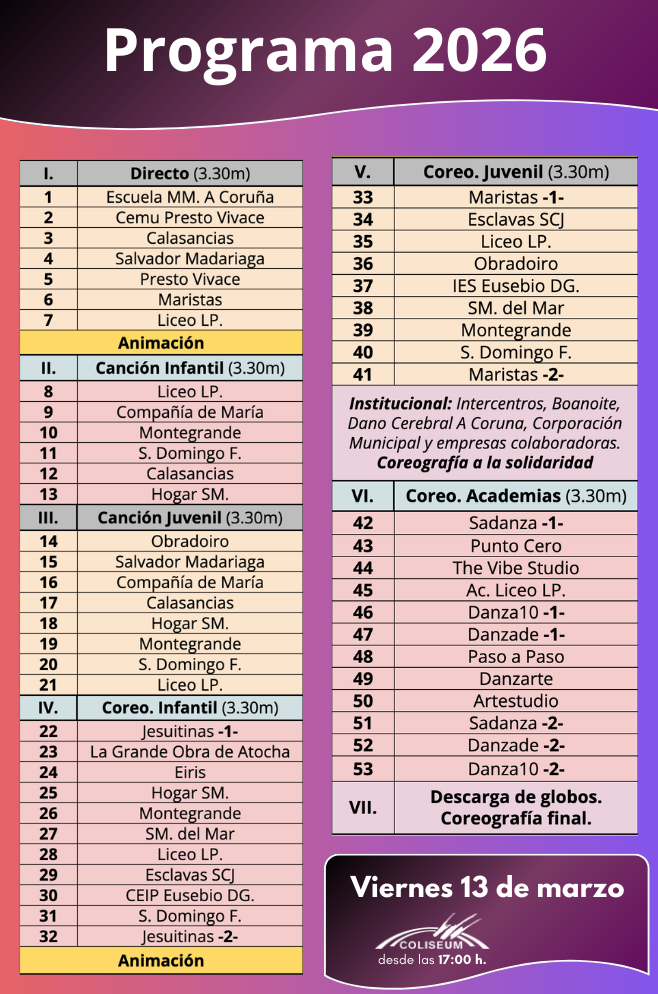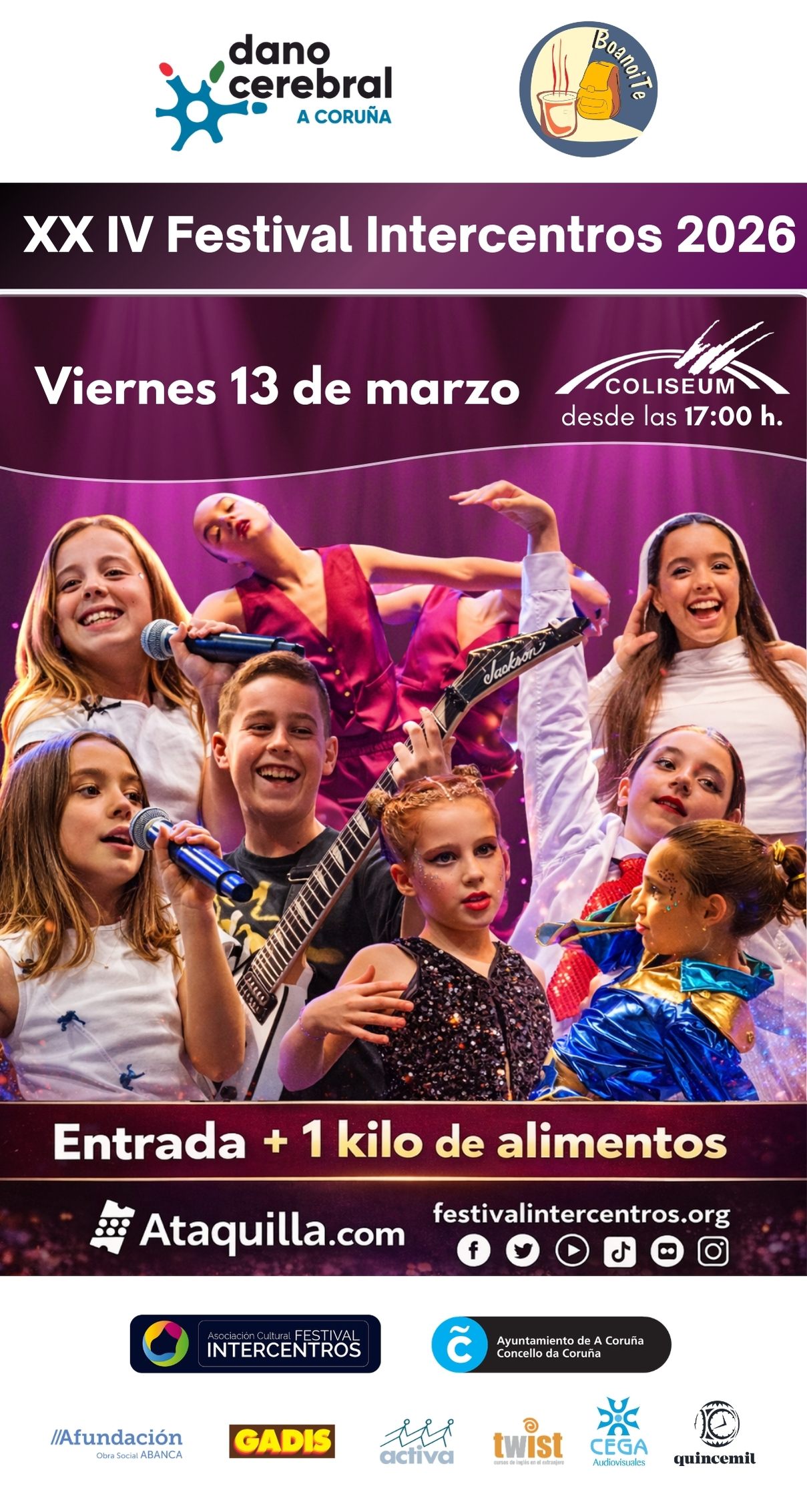 Bienvenidos a una nueva edición del Festival Intercentros, ciudad de A Coruña, curso 25/26, en favor de Daño Cerebral A Coruña y Boanoite. Nuestros proyectos tienen dos grandes galas musicales y solidarias, Colegio S. Domingo F. (Dominicos) y la macro gala final en el Coliseum de la ciudad, con la participación de treinta instituciones. Intercentros es una actividad educativa, musical y solidaria patrocinada por el Excelentísimo Ayuntamiento de A Coruña. Este año la gala final será el viernes 13 de marzo, a partir de las 17:00 h. El 2027 celebrará veinticinco años, ofreciendo a la ciudad un proyecto educativo en favor de los más necesitados.
